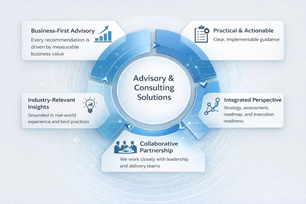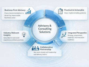 We act as an extension of your leadership team—bringing together business acumen, technology expertise, and structured advisory frameworks to ensure that strategy, operations, and technology work in harmony