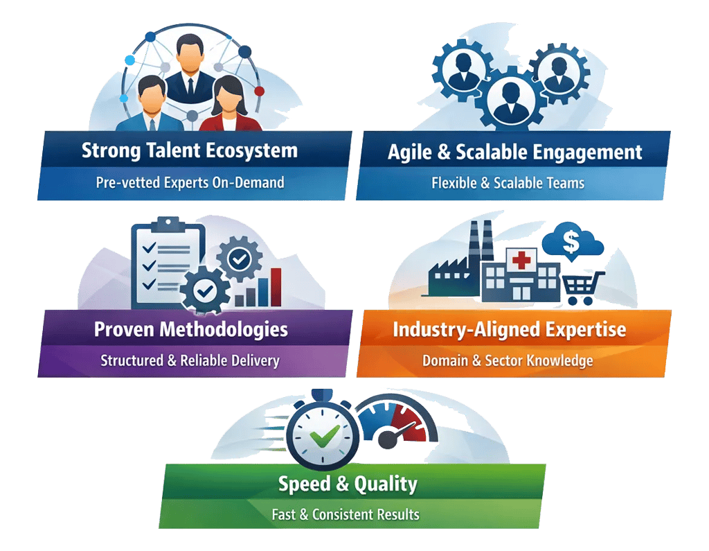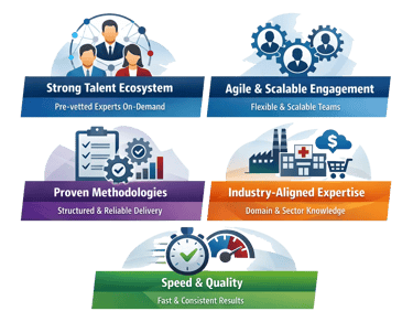 Our On-Demand Talent model ensures you can instantly access pre-vetted, domain-experienced professionals who integrate seamlessly into your teams and workflows without committing to permanent hires. The value you gain: